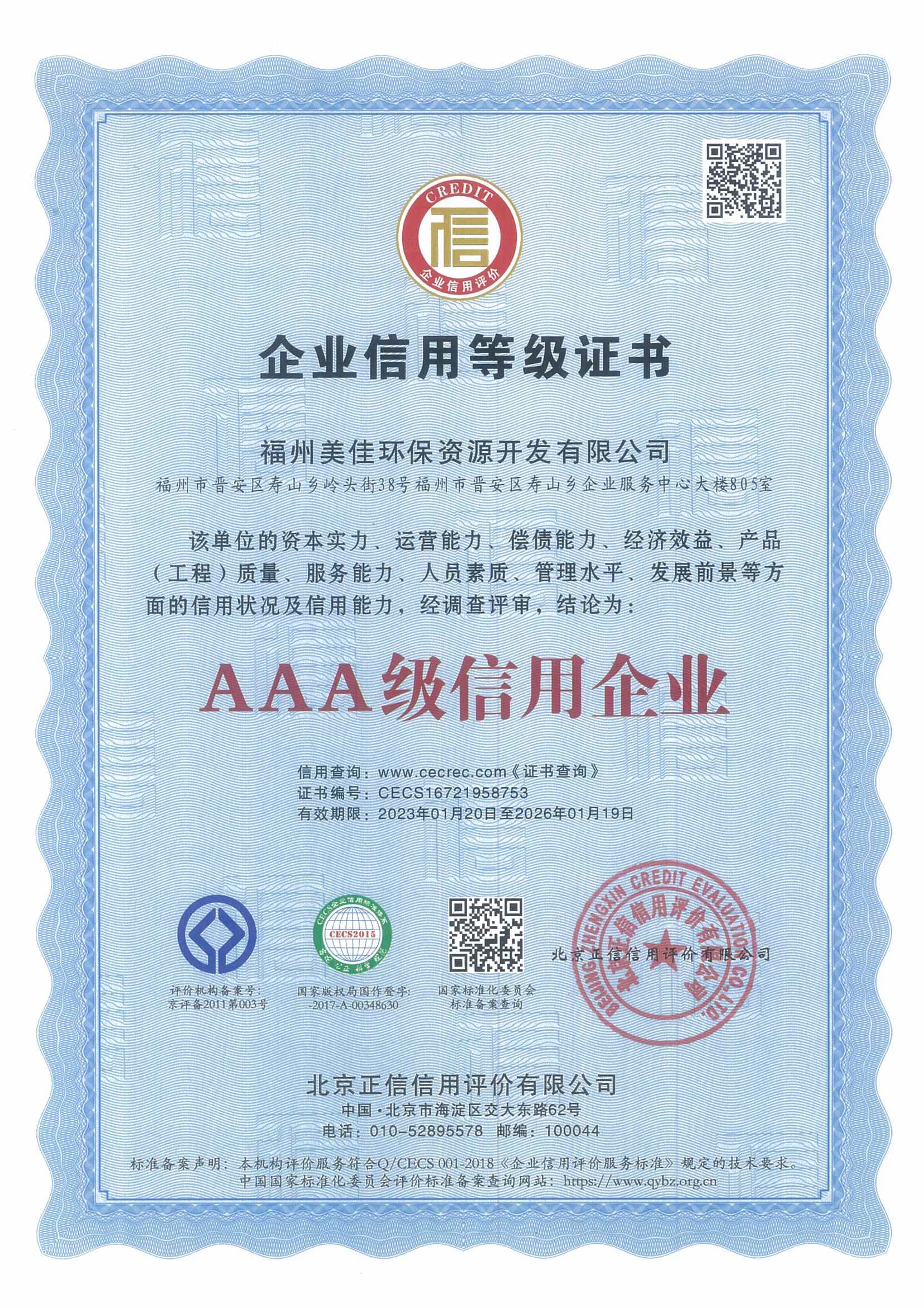 质量信用AAAAA等级认证证书