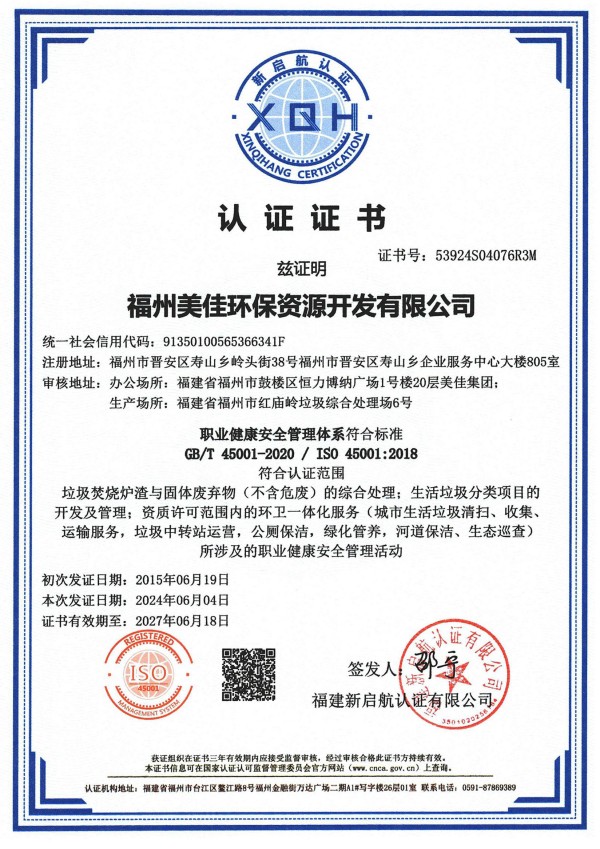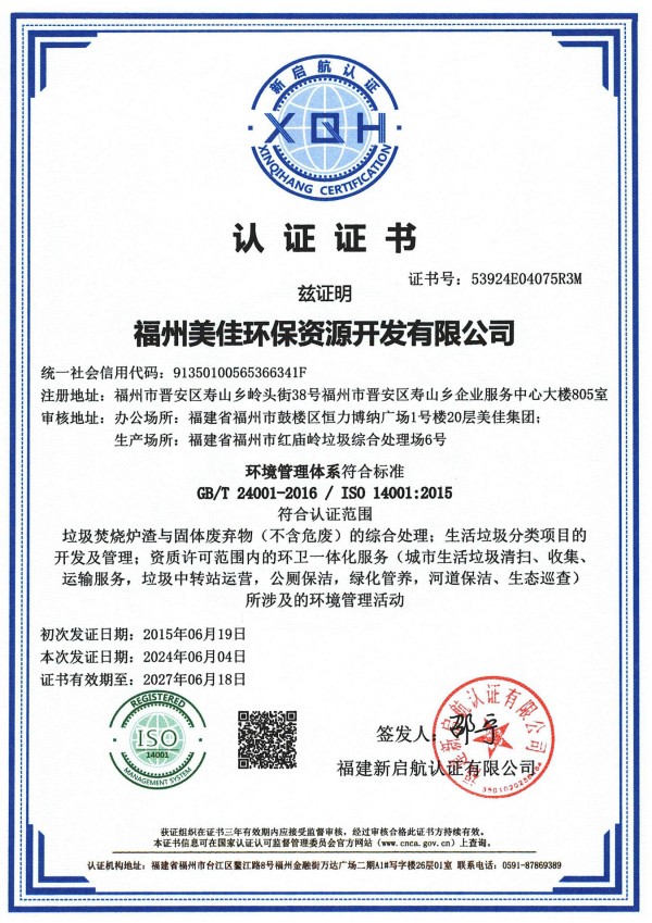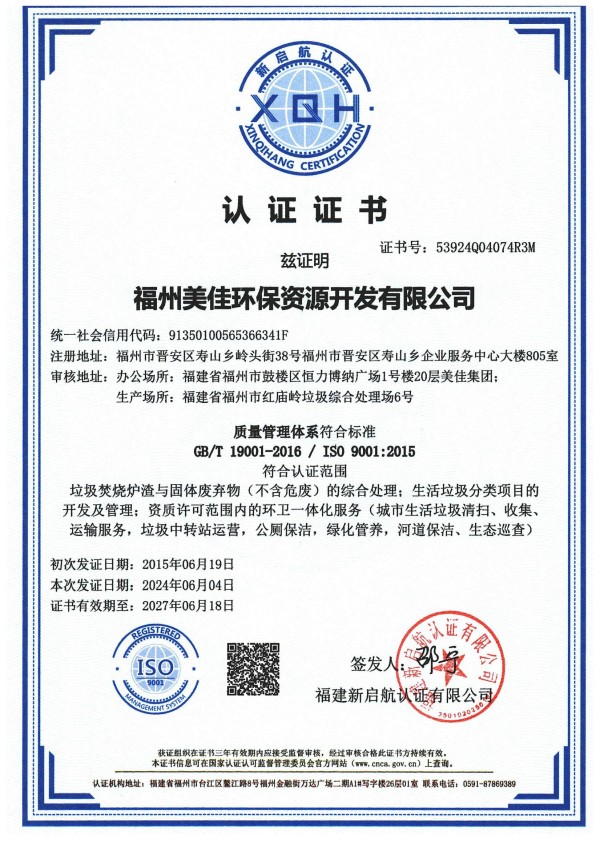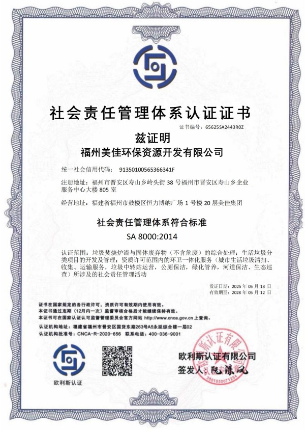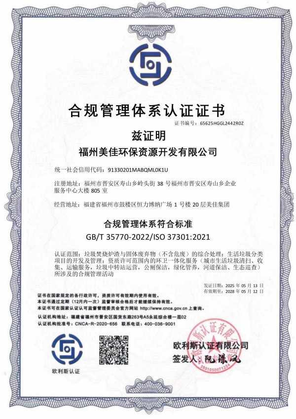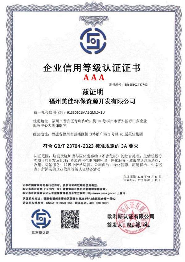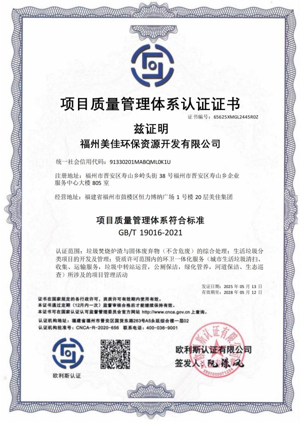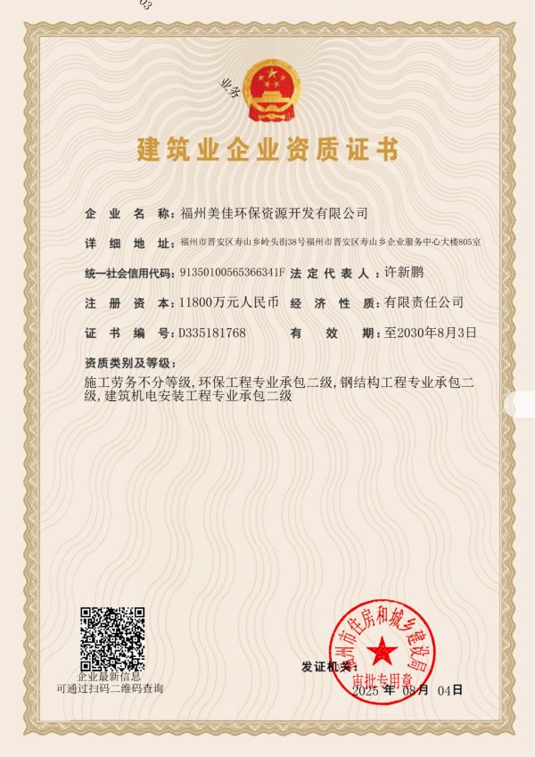 美佳环保从福州起步,经过长期以来的布局发展,现已在全国多个省市投建项目,拥有多个高素质的环保技术研发团队、环保工程建设团队,并且具有市政、环保工程专业承包、钢结构工程专业承包等多项建筑业企业施工总承包资质。其中福州市红庙岭垃圾焚烧炉渣综合利用工程多次被评为“福建省先进环保实用技术示范工程”。截至目前,公司获超100项技术专利,“国家高新技术企业”、”福建省‘专精特新’中小企业“、“全国环保优秀品牌企业”、“中国环境卫生行业企业信用评价AAA企业”、“福建省科技小巨人领军企业”、”福建省知识产权优势企业“、“福州市知识产权示范企业”等资质荣誉,并通过了ISO9001质量管理体系、ISO14001环境管理体系、ISO45001职业健康安全管理体系认证。