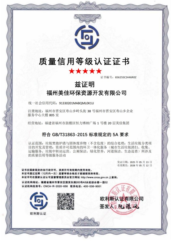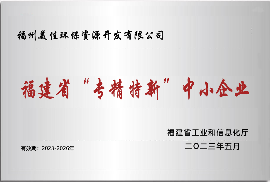 美佳环保从福州起步,经过长期以来的布局发展,现已在全国多个省市投建项目,拥有多个高素质的环保技术研发团队、环保工程建设团队,并且具有市政、环保工程专业承包、钢结构工程专业承包等多项建筑业企业施工总承包资质。其中福州市红庙岭垃圾焚烧炉渣综合利用工程多次被评为“福建省先进环保实用技术示范工程”。截至目前,公司获超100项技术专利,“国家高新技术企业”、”福建省‘专精特新’中小企业“、“全国环保优秀品牌企业”、“中国环境卫生行业企业信用评价AAA企业”、“福建省科技小巨人领军企业”、”福建省知识产权优势企业“、“福州市知识产权示范企业”等资质荣誉,并通过了ISO9001质量管理体系、ISO14001环境管理体系、ISO45001职业健康安全管理体系认证。