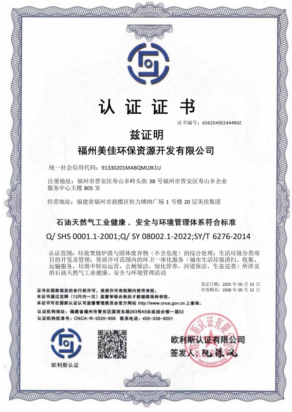 安全与环境管理体系认证证书